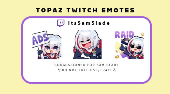 • All prices and payments I sell are in USD.• I only accept PayPal for payments as of now.• I do not animate emotes for the meantime! (In the future I will open more comm types)• I accept refunds when I didn't start with the commission. I won't accept refunds when I start with it.• I hold the right to cancel the commission if it makes me uncomfortable.• Provide references/information for me to draw for your commission!• I will send sketches for approval, feedbacks, revisions, and changes of the WIP before finishing the commission.• I will send major updates of the commission, to ensure the progress of the commission!• If there are deadlines for me to meet, please notify me before I start the commission! (Charge with the rush fee)• For finished emotes, you will recieve PNG format.• For commercial rights, there will be a charge. You are allowed to do anything with the emote.• For non-commercial emotes, can be use in streaming platforms, profile, icons, wallpapers, and personal use.• Never train/use it with AI and/or resell them. My commissions and artworks are not for training and reselling.• Detailed elements/characters turned to simplified.• Once the commission is distributed, please add credits!